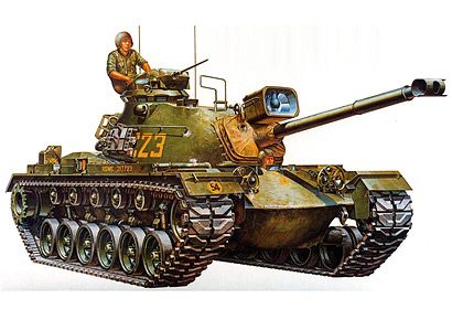 The A3 series of the M-48 was the first to introduce the new AVDS-1970-2 diesel engine which was a major improvement and since its introduction many of the earlier Pattons have also been retrofitted with it. When used in Vietnam secondary armament was often boosted by adding a .50 calibre machine gun above the cupola; a 7.62mm machine gun in front of the loaders hatch and another 7.62mm MG in the mantlet in lieu of the telescopic sight. Early in its production the M-48 was fitted with a snorkeling kit which enables it to fork water obstacles up to 4.1 meters in depth. The M-48A3 uses a coincidence-type range finder for sighting its main 90mm gun. Range data from this sight is fed into a ballistic computer for very accurate and speedy target acquisition. Maximum road speed of the M-48A3 was 48km/h. Maximum range was 460 km and the maximum road gradient was 60%. The A3 carried 62 rounds of 90mm ammunition and up to 5900 rounds for the 7.62 MGs. The A-3 model can be seen with either 3 or 5 wheel track bogies and the majority used in Vietnam had five bogies due to the jungle type of terrain encountered. Tank crew members often built up the sides of the turret with extra padding and equipment for additional protection from hostile fire. A great many of the existing M-48 tanks around the world are now being up graded to M-60 standards with the addition of the 105mm gun in place of the 90mm main unit.